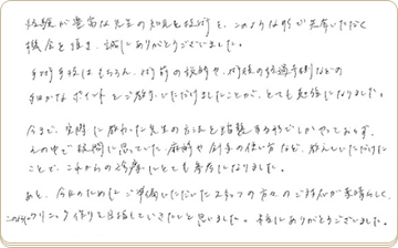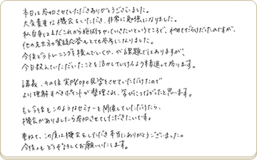 • 普段はなかなか勉強の場を得ることができず悩んでおりました。そんな中このような機会を頂戴でき本当に感謝しております。