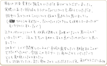 • 私自身はまだこれから施術をやっていきたいというところで、初めてだらけだったのですが、他の先生方の質疑応答もとても参考になりました。
