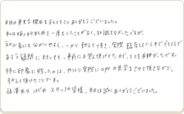 先生のこれまでの経験、知識を余すことなくオープンに教えてくださったと感じています。